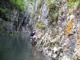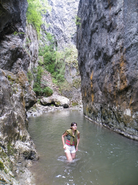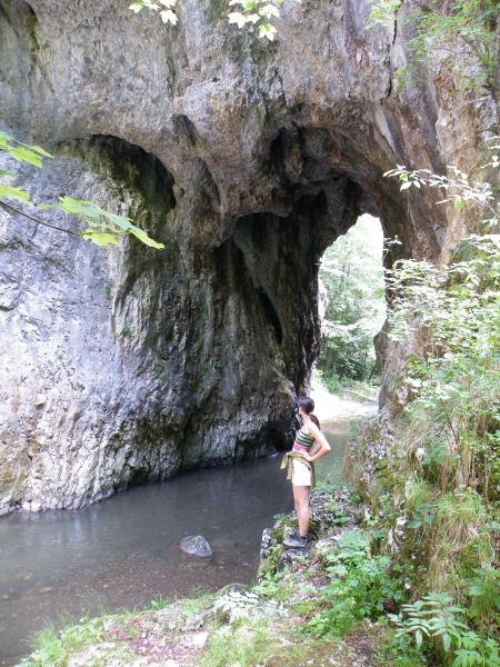 Sambata ne-am trezit intarziat si am mers la cumparaturi in sat incercand zadarnic sa achizitionam o harta ( la cabana nu aveau si la Manastirea Ramet se terminasera). A trebuit sa ne multumim cu indicatiile si harta de la cabana Cheile Rametului. Spre chei traseul urmeaza crucea albastra trecand pe langa grote si pe langa o arcada deosebita- dovada a unei foste pesteri. Dupa putin timp cheile se ingusteaza si nivelul raului creste facand inaintarea mai grea. Este si momentul in care grupul nostru de 4 se ramifica in doua echipe. Eu si Anca hotaram sa facem o baie si sa parcurgem mai departe traseul prin albia raului iar Alina si Stefan decid sa ocoleasca cheile pe Brana Caprelor.